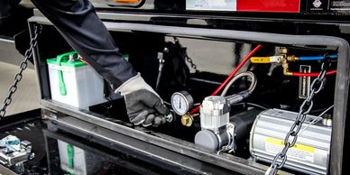 Air-Ride equipped with straps, chains, binders, ramps, and heavy duty tarps to meet all of our customers needs.